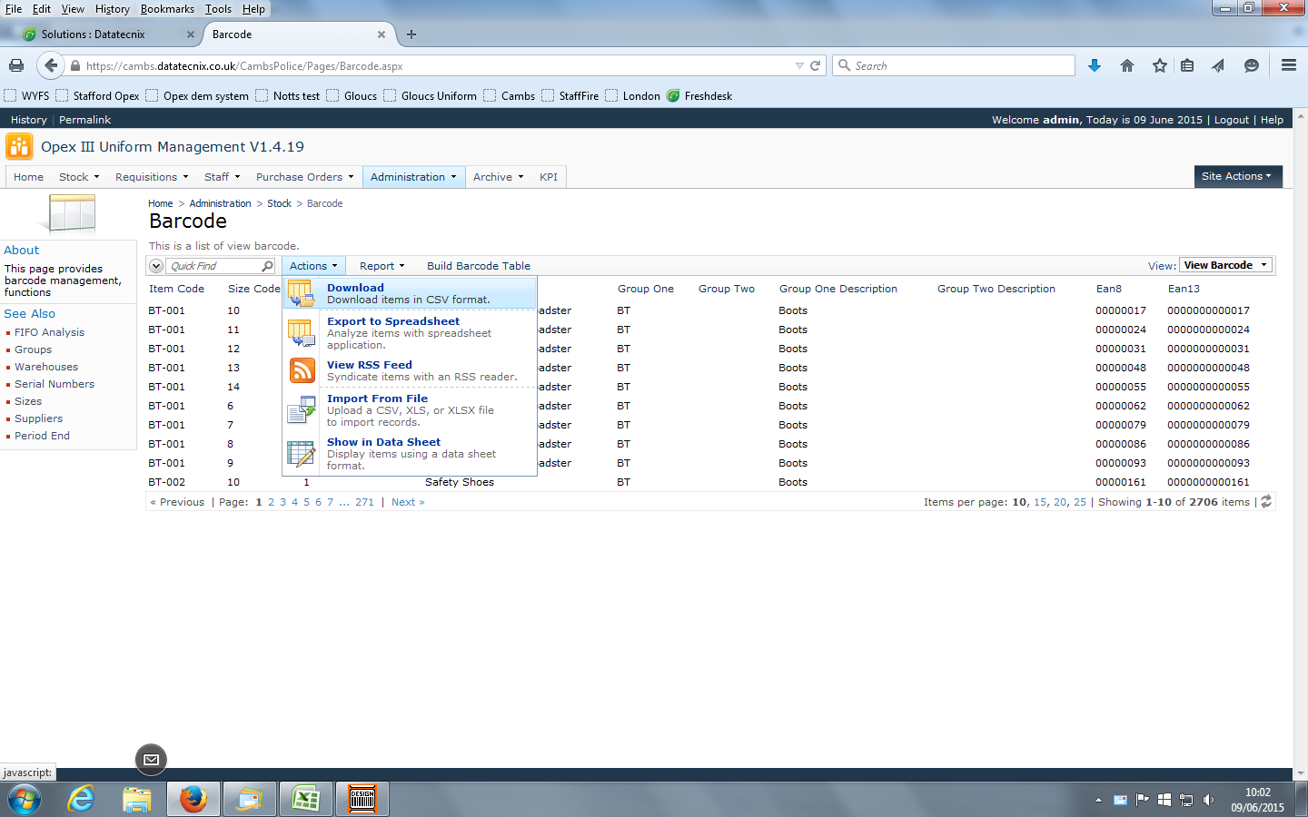 In Opex III go to Administration then Stock then click on Barcode.