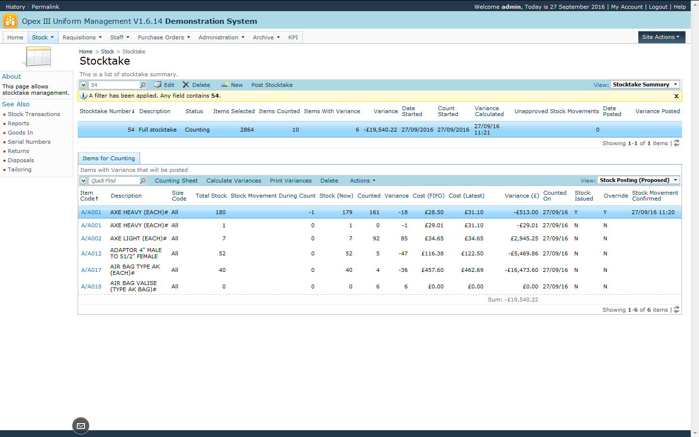 Example: In the screen shot below a requisition has been dispatched during stocktake for 1 x A/A001.