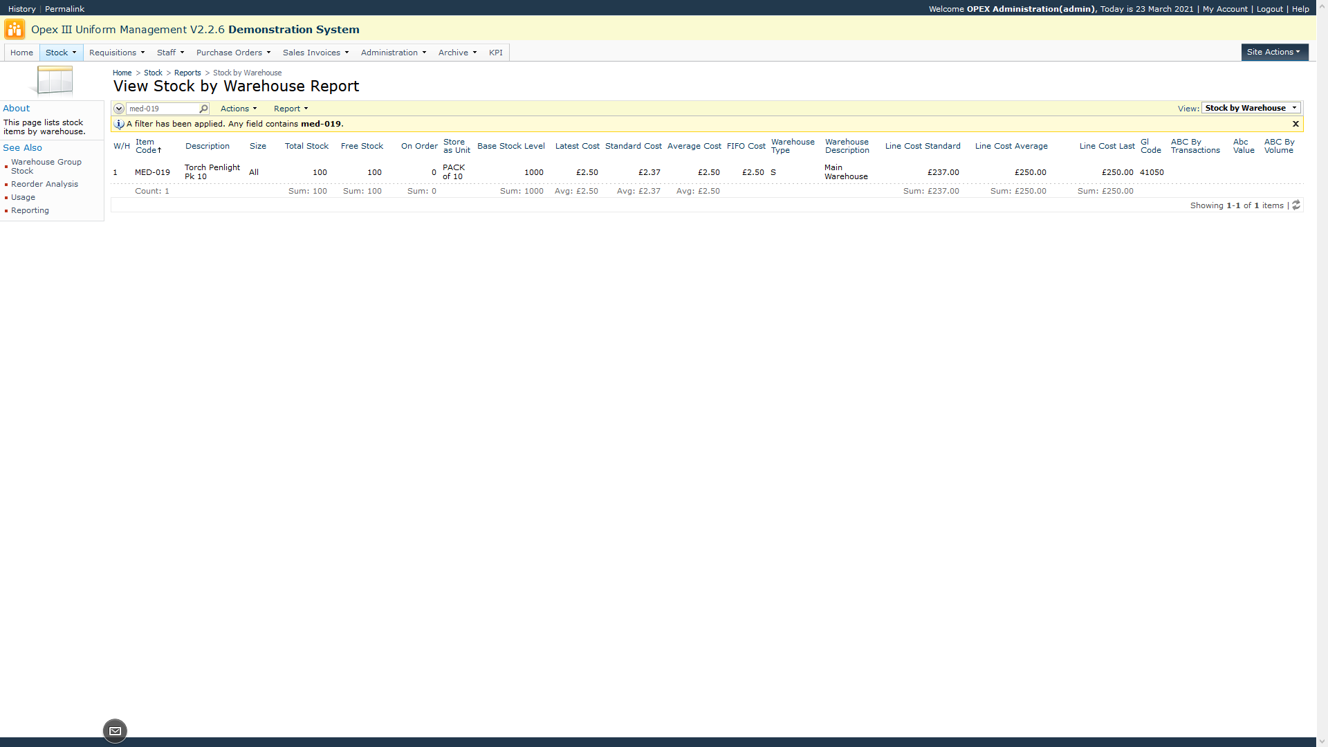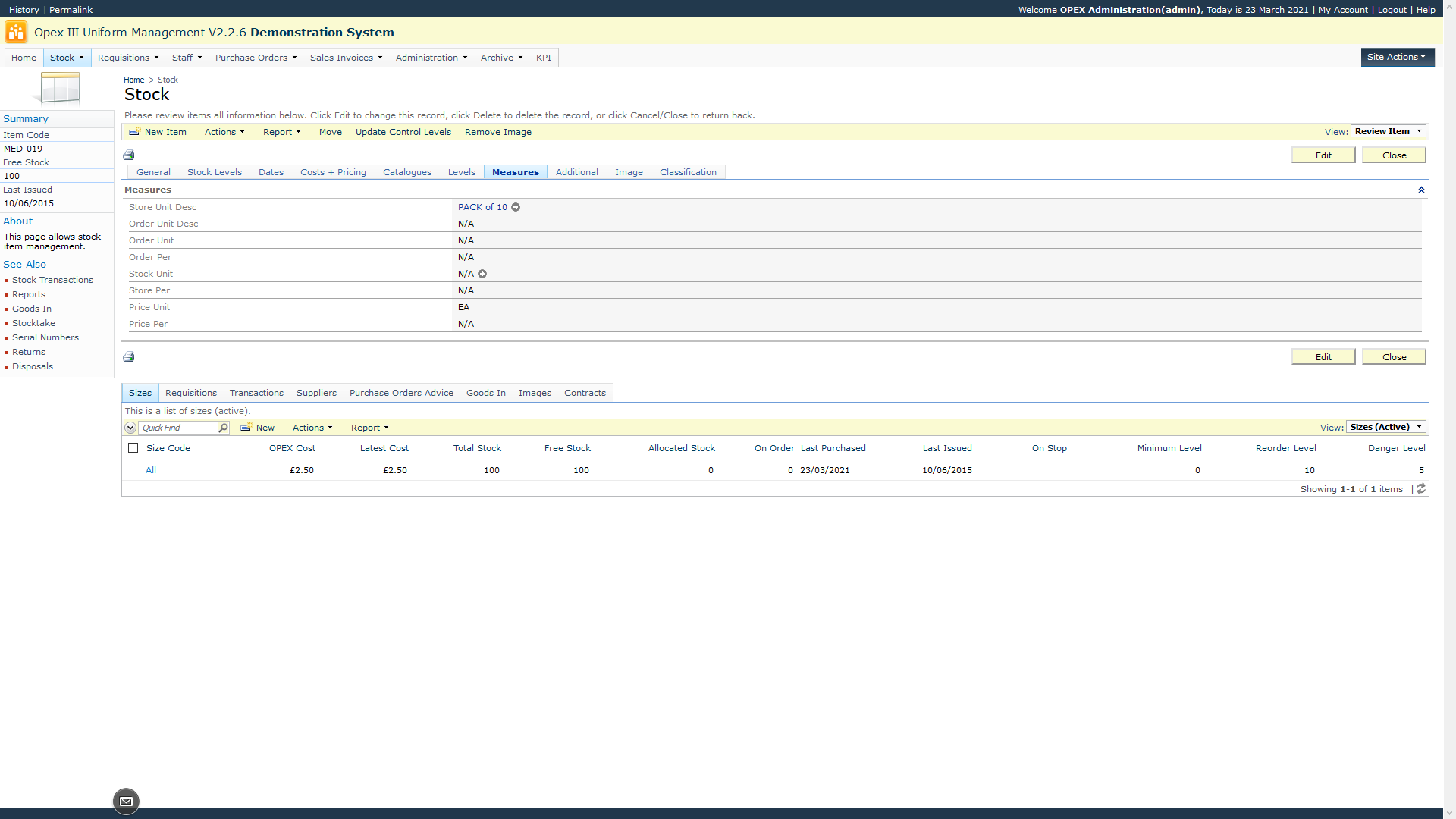 In the screen below the stock item is ordered, stocked and issued in packs of 10, so no conversion is required. There are 100 boxes of 10 in the warehouse. The Base Stock Level column shows the total number of individual items, in this case 1000 (100 x 10).