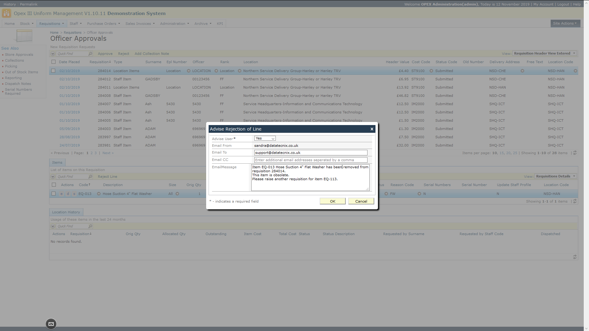 Click on the Items tab and the Reject Line button will be displayed. Reject Line will cancel the line and send a notification email to the officer informing them that the line has been removed/cancelled from the requisition. Before the email is sent you can add additional text and a CC Email address if required. Alternatively, you can choose not to notify the officer by email by selecting 'No' to Advise User.