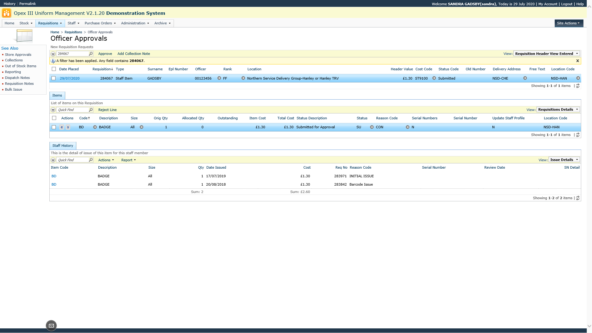 If the officer is entitled to the items and the quantities and reason codes are correct click the Approve button from the top grid.